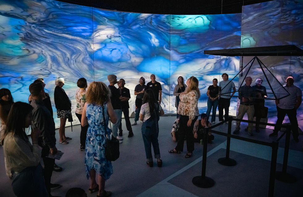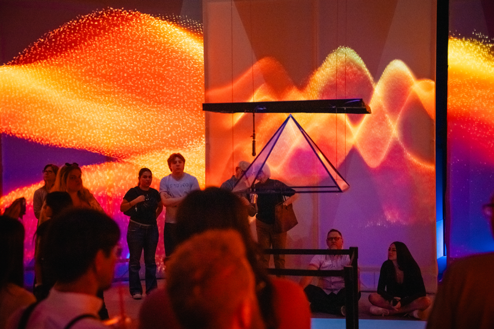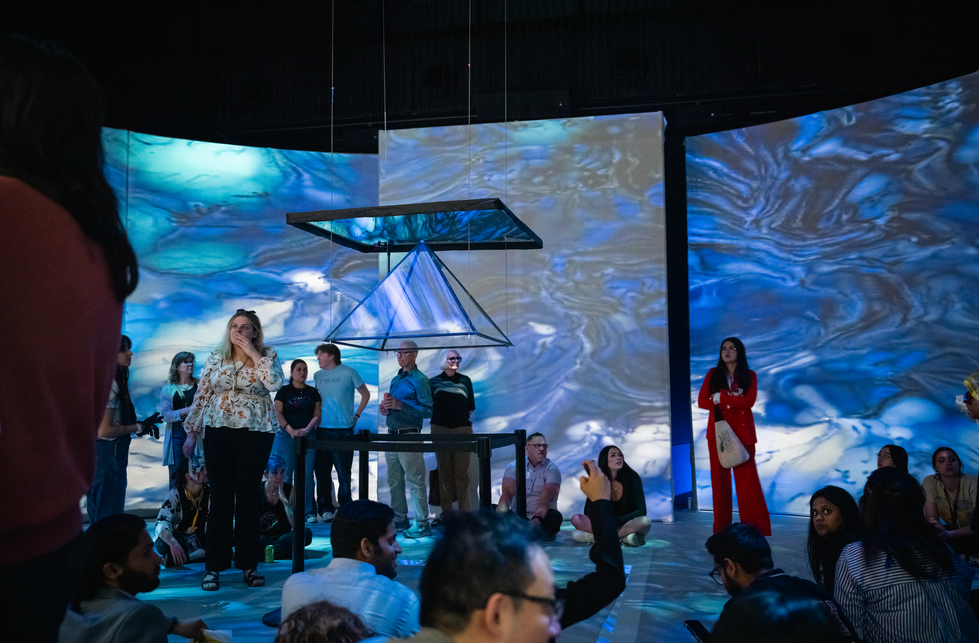 As visitors step into the space, they are enveloped by a panoramic projection of fluid, evolving visuals generated using TouchDesigner. Colors shift like silks in the wind, patterns bloom and dissolve, and rhythmic pulses echo through a spatial audio system, composed and performed live. The environment breathes, reacting and flowing in a way that feels both ancient and futuristic.